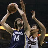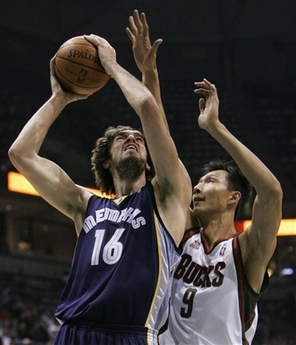 Memphis Grizzlies forward Pau Gasol (16), of Spain, drives to the basket against Milwaukee Bucks center Yi Jianlian (9) of China, during the first half of an NBA basketball game Wednesday, Nov. 14, 2007, in Milwaukee. [Agencies]