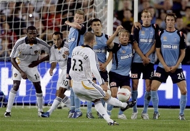 Los Angeles Galaxy's David Beckham, of England, center, scores a goal from a free kick during an exhibition soccer match against Sydney FC at Sydney's Olympic Stadium, Tuesday, Nov. 27, 2007. Sydney FC won 5-3. [Agencies]