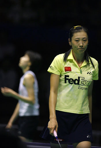 Xie Xingfang (back) and Zhang Ning of China compete during the IBF Super Series China Open on Saturday in Guangzhou. Xie and Zhang, the world's top two women's singles players, were unable to stop a dark-horse run by Malaysian Wong Mew Choo, who defeated four Chinese players in a row en route to winning the most important title of her career. [Xinhua]