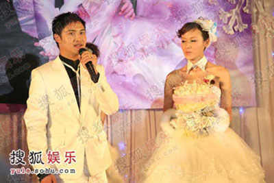 China's diving prince, 2000 and 2004 Olympic champion Tian Liang (R) and 2005 Super Girl contestant Ye Yiqian (L) are seen at their wedding ceremony in Shangri-La Hotel, Xi'an of Northwest China November 29, 2007. The pair's love story has been in spotlight in China since 2006. [sohu]