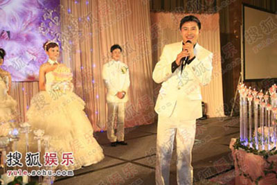 "Diving Prince" Tian Liang (R), former Olympic champion speaks as Ye Yiqian (C), a Super Girl singer watches at their wedding ceremony in Shangri-La Hotel, Xi'an of Northwest China November 29, 2007. The pair's love story has been in spotlight in China since 2006. Tian broke up with the national team after the 2004 Athens Olympic Games. [sohu]