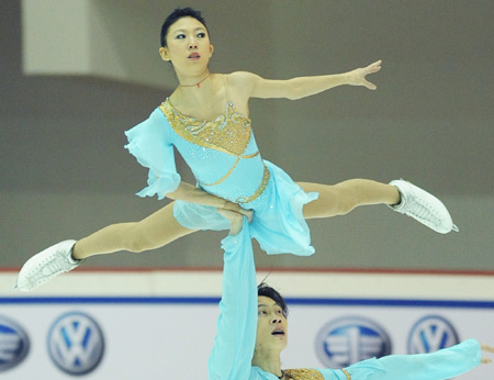 Pang Qing (front) and Tong Jian perform their pair figure skating routines at the 2007-2008 National Figure Skating Grand Prix, Changchun December 24, 2007. The pair was the runners-up with 175.45 points. [Xinhua]