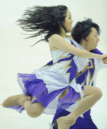 Yu Xiaoyang (L) and Wang Chen perform their ice-dancing routines at the 2007-2008 National Figure Skating Grand Prix, Changchun December 24, 2007. The pair won the ice-dancing title with 145.34 pionts. [Xinhua]