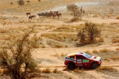 2007 Rally Dakar winner, French driver Stephane Peterhansel and French co-driver Jean-Paul Cottret steer their Mitsubishi past camels, cows and sheep during the 10th stage of the Dakar rally near Nema, Mauritania, in this Jan. 16, 2007 file picture. [Agencies]