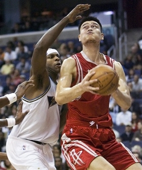 Houston Rockets' Yao Ming, right, of China, is guarded by Washington Wizards center Brendan Haywood during the first half of their NBA basketball game Tuesday, Jan. 8, 2008, in Washington. [Agencies]