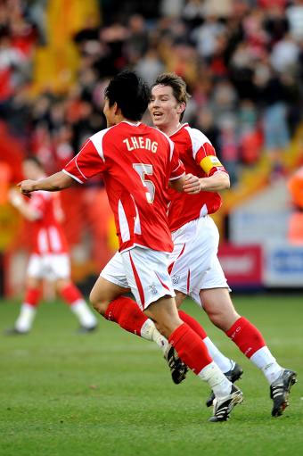 Chinese international footballer Zheng Zhi (f) celebrates a goal for Charlton during the Coca-Cola Championship match against Blackpool on Saturday. [sina]