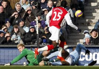 Two goals for Emmanuel Adebayor and one for Eduardo de Silva made Arsenal the first team to win at City in the league this season and put them on 60 points from 25 games. United, who could have returned to the summit with a win, trailed to Dimitar Berbatov's first half effort but levelled three minutes into added time with a close-range Carlos Tevez volley that went in off Spurs defender Michael Dawson. "It's going to be nip and tuck from now until the end of the season," relieved United manager Alex Ferguson told Sky Sports. "We took a lot of risks in the last 20 minutes and feel we deserved a point." United are now two points behind Arsenal, with third-placed Chelsea six adrift of the leaders after a 1-1 draw at Portsmouth for whom transfer deadline-day signing Jermain Defoe scored on his debut to cancel out Nicolas Anelka's opener. Defoe's leveller denied Chelsea a club record 10th consecutive victory in all competitions. "We lost two points, we created lots of chances," Chelsea manager Avram Grant told the BBC, adding that he felt Defoe's goal should have been flagged offside. Everton stayed fourth after a 0-0 draw at Blackburn Rovers, one point above Liverpool who won in the league for the first time since Boxing Day and have a game in hand. Second half goals for Peter Crouch, Fernando Torres and Steven Gerrard earned a 3-0 home win over Sunderland to relieve some of the pressure on Liverpool manager Rafael Benitez. Wigan Athletic moved out of the relegation zone with a 1-0 home win over West Ham United while Birmingham City dropped into it after being held 1-1 by basement club Derby County. Reading lost their sixth league match in a row, 2-0 at home to Bolton Wanderers. UNITED BELOW-PAR United minimised the damage of a below-par performance with the last kick of the game at White Hart Lane to deny Tottenham a first win over them since 2001. With virtually every player on the pitch inside the Spurs area for a late corner, including United keeper Edwin Van der Sar, Argentina forward Tevez connected at the near post and the ball ended up in the net. Tottenham, beaten 3-1 by United in the FA Cup last week, were good value for the lead they took in the 21st minute through Bulgarian Berbatov after Van der Sar failed to hold a low cross from Aaron Lennon. "When you're playing a team like Manchester United you can't consider it being two points lost, even though we were so close to winning the game and conceding an own goal in the very last minute is very hard," Spurs manager Juande Ramos told reporters. Earlier, Arsenal striker Adebayor took his league tally this season to 18. He opened the scoring after nine minutes, then turned provider after 26, heading Gael Clichy's cross to Eduardo who chested down and volleyed in. City were handed an unexpected lifeline minutes later when Vedran Corluka robbed Clichy and set up Fernandes for a neat finish past goalkeeper Jens Lehmann, who got a rare start in place of the injured Manuel Almunia. Arsenal had to wait until two minutes from time to make the points safe after Cesc Fabregas's ball reached Adebayor on the edge of the area. City's only other defeat at home this season came against Tottenham in the League Cup. "At the moment I am enjoying myself like a little kid," Adebayor, who has scored eight goals in his last six games, told Sky Sports. "At 2-0 we thought we had already won it but they scored and that made it a bit difficult." |
