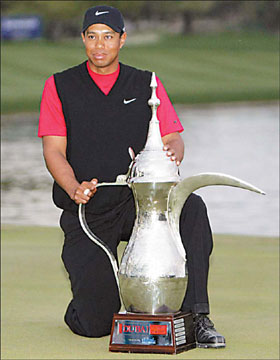The problem, he revealed after his come-from-behind win in the Gulf emirate, was that he cracked the face of his favorite driver with his first shot in Wednesday's Pro-Am. "I broke my driver and had to use my backup which I don't like very much," he said. "I spun it too much, It was fine on Thursday because the wind didn't blow, but as soon as the wind started blowing, I had a hard time controlling the driver because it kept spinning too much. "I was on the periphery most of the day and somehow got into it late in the back nine." The world No 1 started the final round in Dubai four strokes adrift of leader Ernie Els and looked well out of it as he reached the turn still well down the field. But a chip-in at the 12th hole proved to be the spark he needed and with the bit firmly between his teeth, the American let loose with a sequence of power drives and deft putts that saw him come home in 6-under 31. To cap it all a 25-footer for birdie at the last had Woods celebrating with a trademark hook-punch in the air that ellicited the biggest cheer of the week. It quite clearly sent a message to those who believe that Woods is only at his best when he has his nose in front. "I don't know about messages. I'm just happy about winning two tournaments," he said. The win also cements his position in the bustling Gulf region, which he has chosen as the venue for his first foray into golf course design and he has already indicated that he will return to the region next year to defend his title. Meanwhile, Woods' current schedule sees him down to play in the WGC Matchplay tournament in Arizona in a month's time and at the WGC Championships at Doral, Florida in March before heading for Augusta and the Masters. Four tournament wins in a row and seven out of the last eight dating back to the tail-end of last year, the Woods juggernaut rolls on, and for the moment there is no telling where it will stop. |