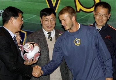 "Beckham is our idol," said Xu Gen Bao, the coach of Shanghai-Hong Kong United, which will play the Galaxy on Wednesday in Shanghai. Beckham, who said he got a "great welcome" from Chinese fans, said at a press conference he hoped to play the full 90 minutes in the exhibition game. The English midfielder missed much of his first season with the Galaxy with injuries to his right knee and left ankle. He's now entering the second year of a five-year, $32.5 million contract with the team. After the Galaxy's swing through Asia, its regular Major League Soccer season will start at the end of March. The Asian tour started in Korea, where Beckham was the only one of five Galaxy players to convert in a penalty shootout as the MLS outfit lost to South Korea's FC Seoul 2-1 in on Saturday. Earlier this year, Beckham was denied his 100th national team appearance by England's new coach Fabio Capello, who thought the Galaxy midfielder would be unfit in his offseason. After the game in Shanghai, the American team's preseason Asian tour will continue with a game against Hong Kong Union on March 9. |