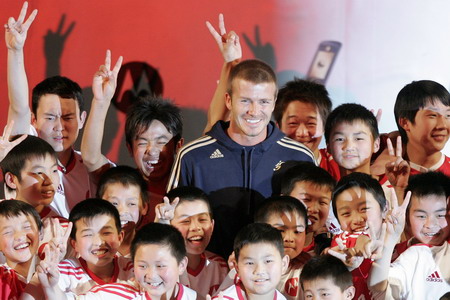 Los Angeles Galaxy's David Beckham poses for a photograph with children during a promotional event in Shanghai March 3, 2008. The Los Angeles Galaxy arrived on Sunday in Shanghai to play a soccer match against Chinese second division side East Asia on March 5. [Agencies]