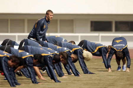 Los Angeles Galaxy's David Beckham participates in a training session in Shanghai March 3, 2008. Los Angeles Galaxy arrived in Shanghai on Sunday to play a match against Chinese second division side East Asia in Shanghai on March 5. [Agencies]
