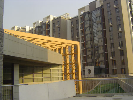 A reception building stands in front of an apartment building in the Olympic Village in this photo taken on March 5, 2008. The Organizing Committee for the Games of the 29th Olympiad (BOCOG) unveiled the village to the press on Wednesday. [chinadaily.com.cn]