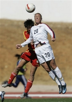 Abby Wambach, right, of United States, jumps for the ball with China's Yan Bi during their Algarve Cup women's soccer match Wednesday, March 5, 2008 in Albufeira, Portugal. Wambach scored once for U.S. in their 4-0 win. [Agencies]