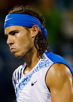 Spain's Rafael Nadal reacts during his quarter-final match against Andy Roddick of the U.S. at the ATP Dubai Tennis Championships March 6, 2008. [Agencies]
