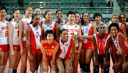 Volleyball players of China and Cuba national team pose for photographs after a friendly match in Jinjiang, Fujian Province, February 25, 2008. China won the game 4-1. [Xinhua]