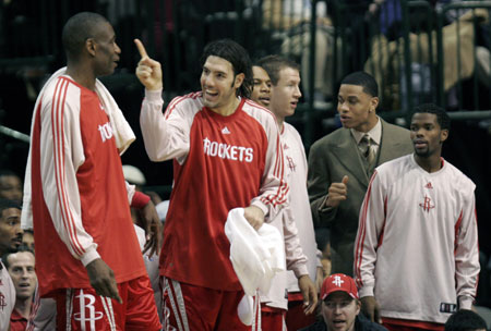 Houston Rockets center Dikembe Mutombo (L) and forward Luis Scola (2nd L) celebrate on the bench in the second half of their NBA basketball game in Dallas, Texas March 6, 2008. [Agencies]