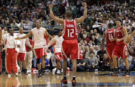 Houston Rockets guard Rafer Alston (12) celebrates as the bench empties late in the second half of their NBA basketball game in Dallas, Texas March 6, 2008. [Agencies]