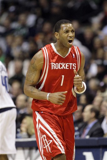 Houston Rockets guard Tracy McGrady celebrates a shot while playing Dallas Mavericks in the second half of their NBA basketball game in Dallas, Texas March 6, 2008. McGrady scored 31 points and Houston roared to their 17th consecutive win in a 113-98 road victor. [Agencies]
