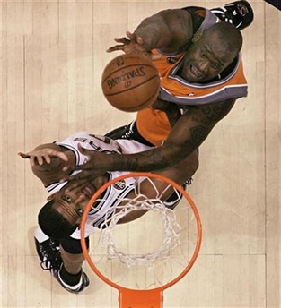 Phoenix Suns' Shaquille O'Neal (R) lays in a basket while being guarded by San Antonio Spurs' Kurt Thomas during fourth quarter NBA basketball action in Phoenix, Arizona, March 9, 2008. Phoenix defeated San Antonio 94-87. O'Neal scored 14 points and grabbed 16 rebounds. [Agencies]