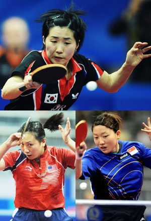 Chinese overseas players Dang Ye Seo of South Korea, Li Jiawei of Sinapore and Gao Jun of the US (closewise) are seen during the World Team Championships in Guangzhou last month. The table tennis governing body has issued a restriction on overseas paddlers. [Xinhua]