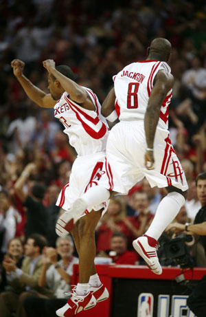 Houston Rockets guard Rafer Alston (L) and guard Bobby Jackson (8) celebrate in the final seconds as they defeated the Los Angeles Lakers for the team's 22nd consecutive win during their NBA basketball game in Houston March 16, 2008. [Agencies]