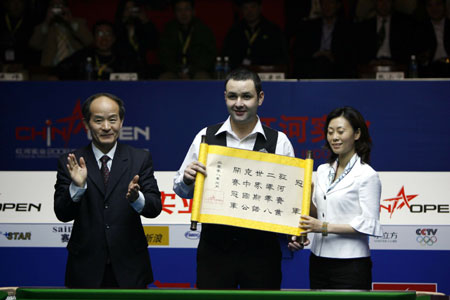 Stephen Maguire from Scotland (Center) poses with his trophy of the 2008 World Snooker China Open in Beijing March 30, 2008. Maguire beat Shaun Murphy from England in the final. [Xinhua]