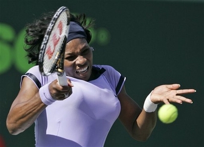 Serena Williams returns a shot from Kaia Kanepi of Estonia during a fourth-round match at the Sony Ericsson Open tennis tournament in Key Biscayne, Fla. Monday, March 31, 2008. [Agencies]