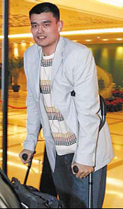 Injured Yao Ming arrives at Beijing International Airport on Thursday night. ]Xinhua]
