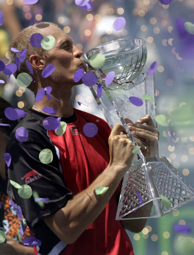 Nikolay Davydenko of Russia kisses the trophy after winning his final match against Rafael Nadal of Spain at the Sony Ericsson Open tennis tournament in Key Biscayne, Florida April 6, 2008. Davydenko won 6-4, 6-2. [Agencies]