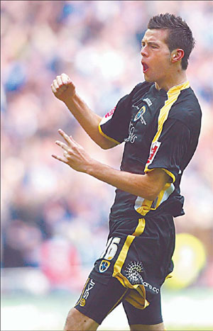 Cardiff City's Welsh midfielder Joe Ledley celebrates scoring a goal during his team's FA Cup semifinal match against Barnsley at Wembley Stadium, north London, on Sunday. [Agencies]