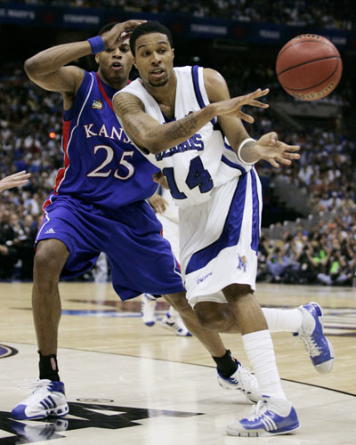 Memphis Tigers' Chris Douglas-Roberts (R) passes the ball while being defended by Kansas Jayhawks' Brandon Rush in the second half of their NCAA Men's Final Four championship basketball game in San Antonio, Texas, April 7, 2008. [Agencies]