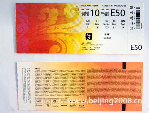 A sample ticket for sports competition of the Beijing 2008 Olympic Games is unveiled by the Beijing Organizing Committee for the Games of the XXIX Olympiad (BOCOG) in Beijing April 23, 2008. The tickets, with the "lucky cloud" design in the background features the pictograms of all the events. The third round of tickets sale will start from May 5. [BOCOG]