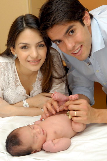 In this photo released by Brazilian soccer player Ricardo Izecson dos Santos Leite, known as Kaka, he is seen with wife Caroline and son Luca, in Sao Paulo, Tuesday, June 10, 2008. Caroline Celico Leite gave birth to Luca at 1:05 a.m, local time, the hospital said in a statement, adding the baby weighed 3.6 kilograms (7.9 pounds) and that 'mother and child are fine.' [Agencies]