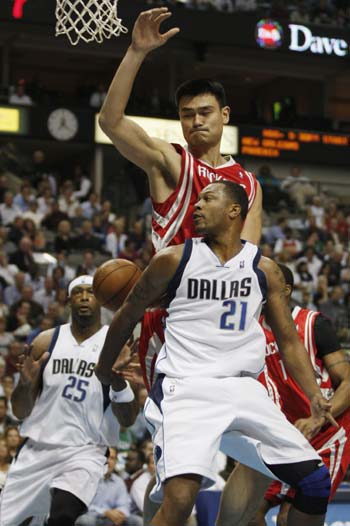 Dallas Mavericks Antoine Wright (R) passes around Houston Rockets Yao Ming (C) to Mavericks teammate Erick Dampier (L) in first quarter NBA action in Dallas, Texas October 30, 2008.[Agencies]