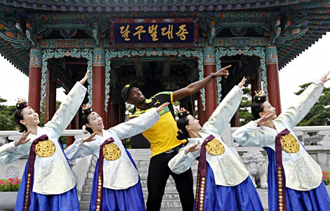 Barcelona's Lionel Messi, who was named the Best Player in Europe for the 2010-11 season, poses with his award during the Champions League draw in Monaco, Aug 25, 2011. [Photo/Agencies]