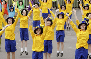 Girls dressed in colours of the Ukrainian national flag perform during the opening ceremony of the Euro 2012 fan zone in Kharkiv, some 480 km (300 miles) east of Kiev, June 7, 2012.