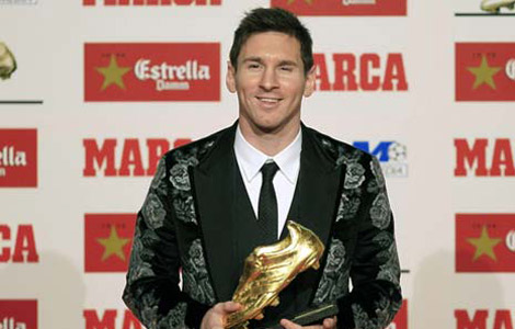 Barcelona forward Lionel Messi was presented with a record third Golden Boot on Wednesday for scoring the most goals in Europe's domestic leagues last season.