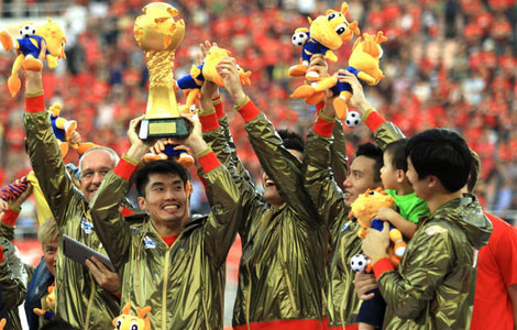 Guangzhou Evergrande players celebrate after beating Wuhan Zall 5-0 at the 30th Chinese Super League to clinch their third consecutive championship, in Guangzhou city of South China's Guangdong province, on Nov 3, 2013.