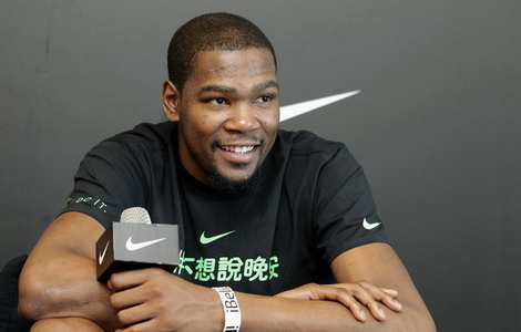 NBA basketball player Kevin Durant of the Oklahoma City Thunder smiles during a news conference in Taipei July 16, 2013. Durant is on a two-day promotional tour in Taiwan.