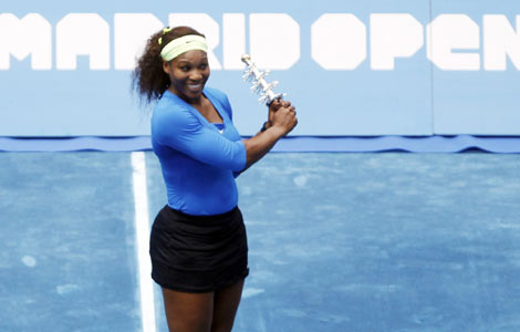 A fired-up Serena Williams sent out a warning to the young pretenders of women's tennis when she powered to a crushing 6-1 6-3 victory over world number one Victoria Azarenka to win the Madrid Open.