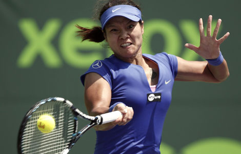Li Na of China hits an overhead to Kiki Bertens of the Netherlands at the Sony Open tennis tournament in Key Biscayne, Florida, March 21, 2013.