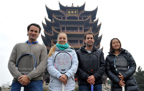 (From left to right) Former French Open champion Carlos Moya, 2011 Wimbledon semifinalist and WTA Comeback Player of the Year Sabine Lisicki and 14-time Grand Slam champion Pete Sampras and Chinese French Open winner Li Na pose for photos in front of the Yellow Crane Tower (Huanghelou), a historic interest of Li’s hometown Wuhan in Central China December 18, 2011.