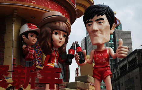A giant doll featuring famous Chinese athlete Liu Xiang, the men's 110m hurdles champion at the Athens Olympic Games and runner-up of the 2011World Championships, appears with other Spring Festival decorations at Raffles Plaza.