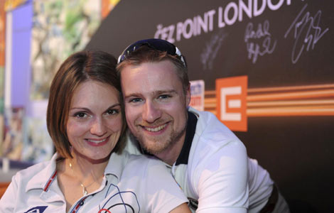 China's top badminton player Lin Dan poses with his bride and former teammate Xie Xingfang at their wedding ceremony in the stadium of Beijing University of Technology September 23, 2012.