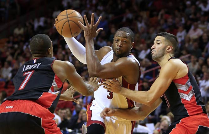 Miami Heat guard Dwyane Wade (3) drives to the basket between Toronto Raptors guard Kyle Lowry (7) and guard Greivis Vasquez (21) in the second half at American Airlines Arena, Nov 2, 2014.