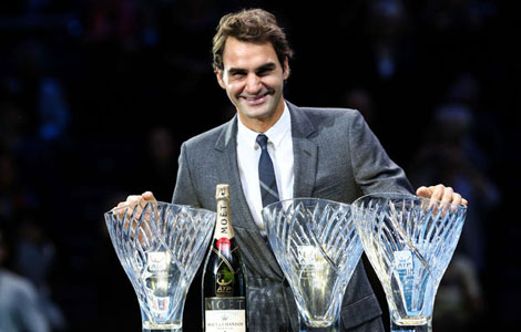 Roger Federer, who has only one title this year, receives the Arthur Ashe Humanitarian of the Year award, the ATP fans' favourite and Stefan Edberg Sportsmanship awards at the ongoing ATP World Tour Finals in London, Nov 6, 2013.