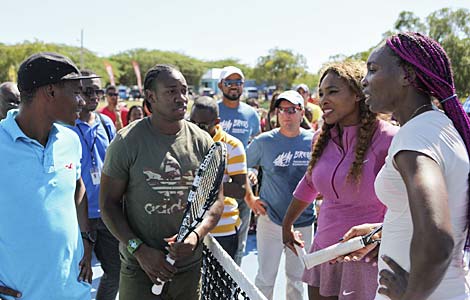 Jamaica's Olympic sprinters Warren Weir (L) and Yohan Blake (2nd L) talk with tennis players Serena and Venus (R) Williams as the sisters hold a special tennis clinic for youth and children at the Treasure Beach Sports Complex in St. Elizabeth, Nov 23, 2013.