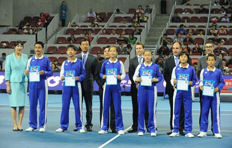 As part of a charity program scheduled during the China Tennis Grand Prix, national team representatives Liang Chen and Chang Yu visited a children's welfare center in the balmy tourist town of Sanya, along with with Tom McCarty, CEO of the event's promoter, Beijing International Group, on Wednesday.