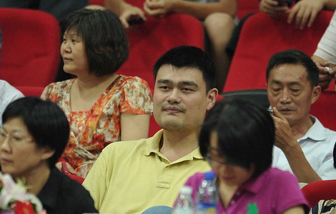 Yao Ming, retired Chinese basketball player, smiles as he watches a China-Serbia basketball game from the sideline in Kunshang, East China's Jiangsu province, June 24, 2012.