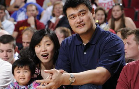 Former Houston Rockets center Yao Ming and his wife Ye Li sit courtside with 22-month-old daughter Amy while watching the Rockets' NBA game against the Dallas Mavericjs at the Toyota Center in Houston.